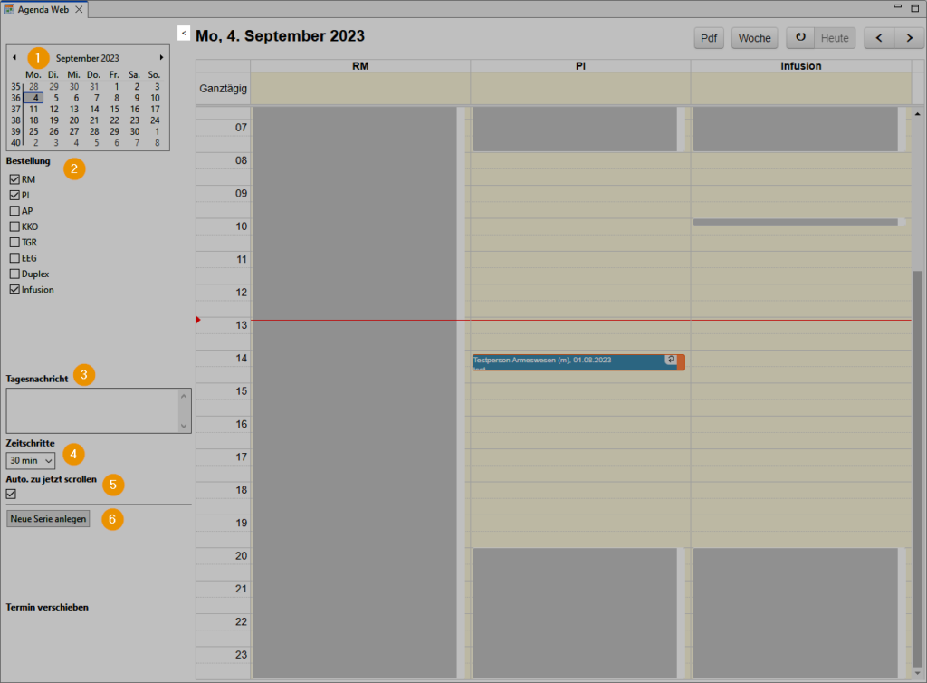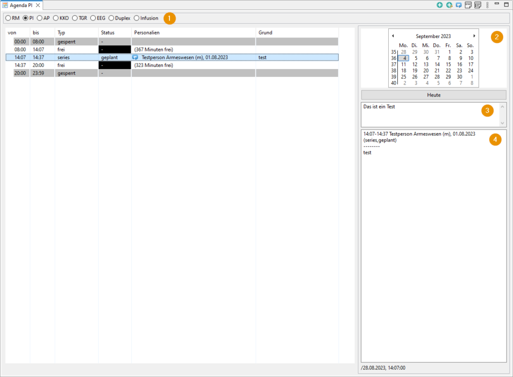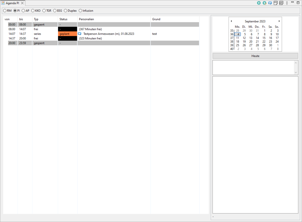 - Termin-Infos: Im Feld unten rechts werden die Informationen vom ausgewählten Termin angezeigt.