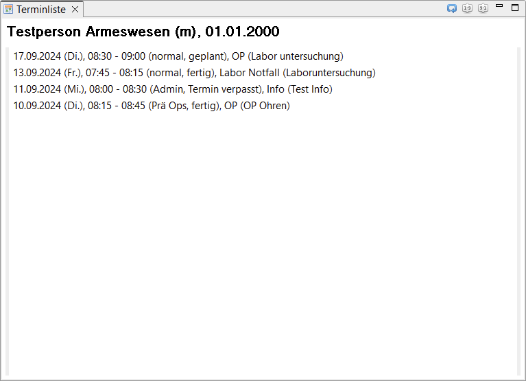 Diese View zeigt einen Überblick über die bereits eingetragenen und noch ausstehenden Termine eines Patienten.