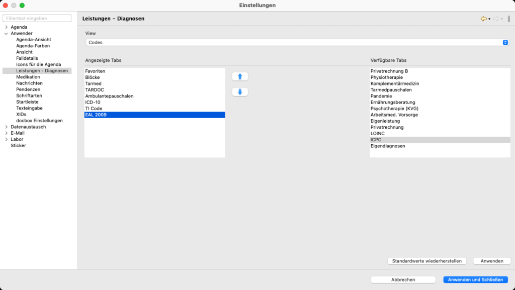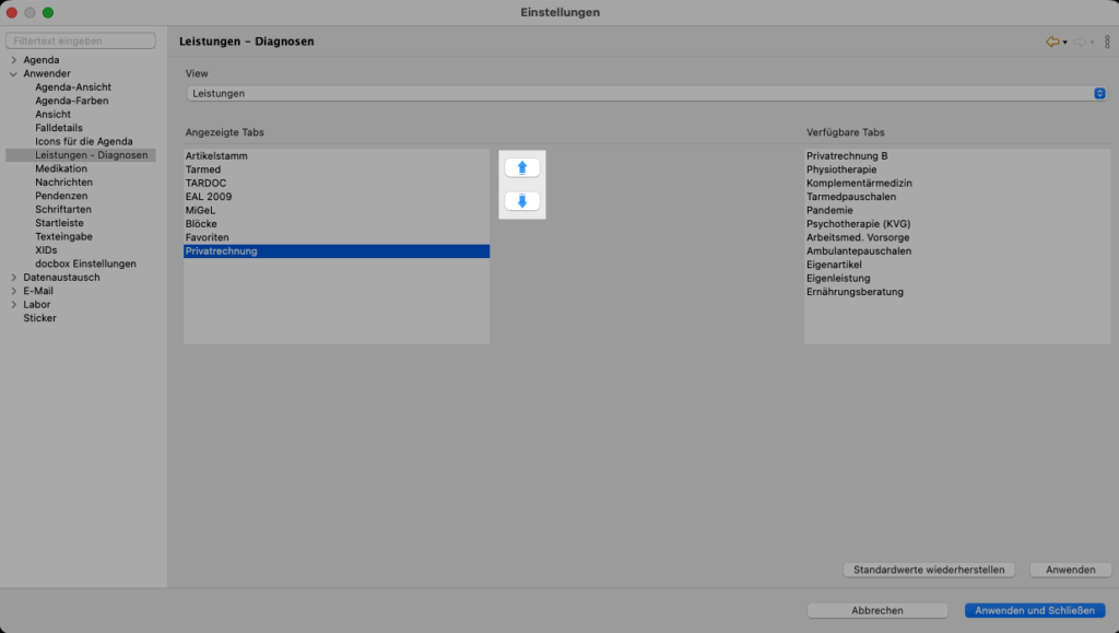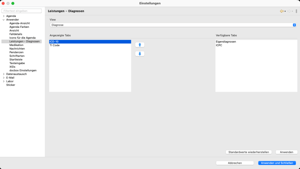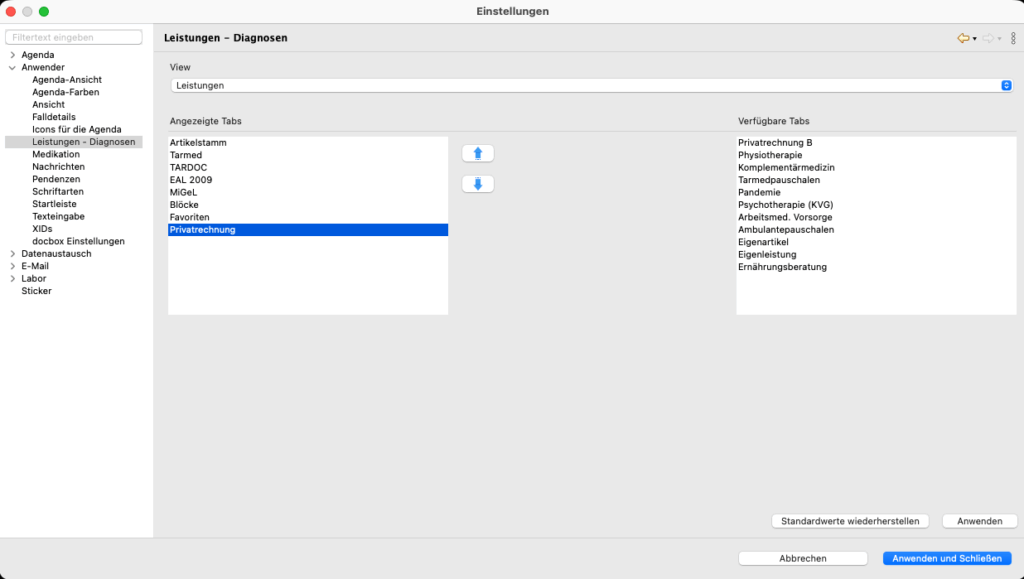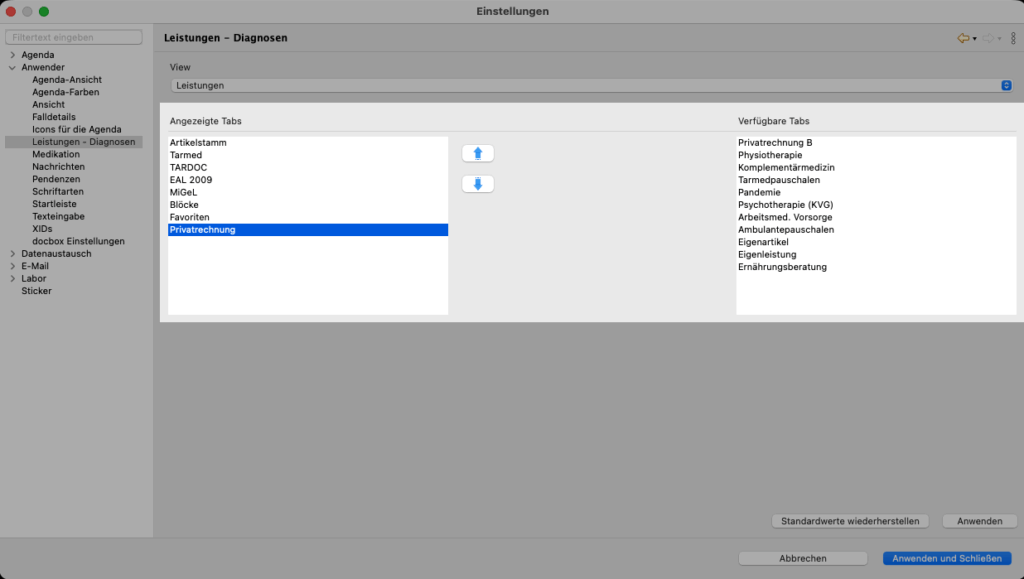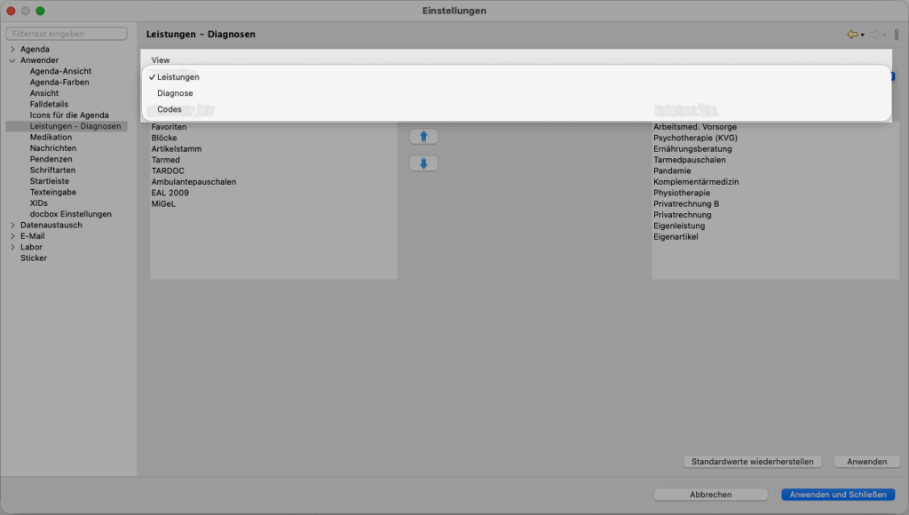 - Datei –> Einstellungen –> Anwender –> Leistungen – Diagnosen