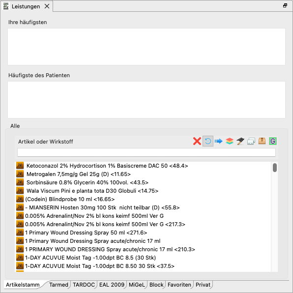 Wenn Sie den Tab Privatrechnung nicht anzeigen möchten, ziehen Sie ihn in die Liste Verfügbare Tabs. Er wird danach in der Ansicht Leistungen nicht mehr angezeigt.