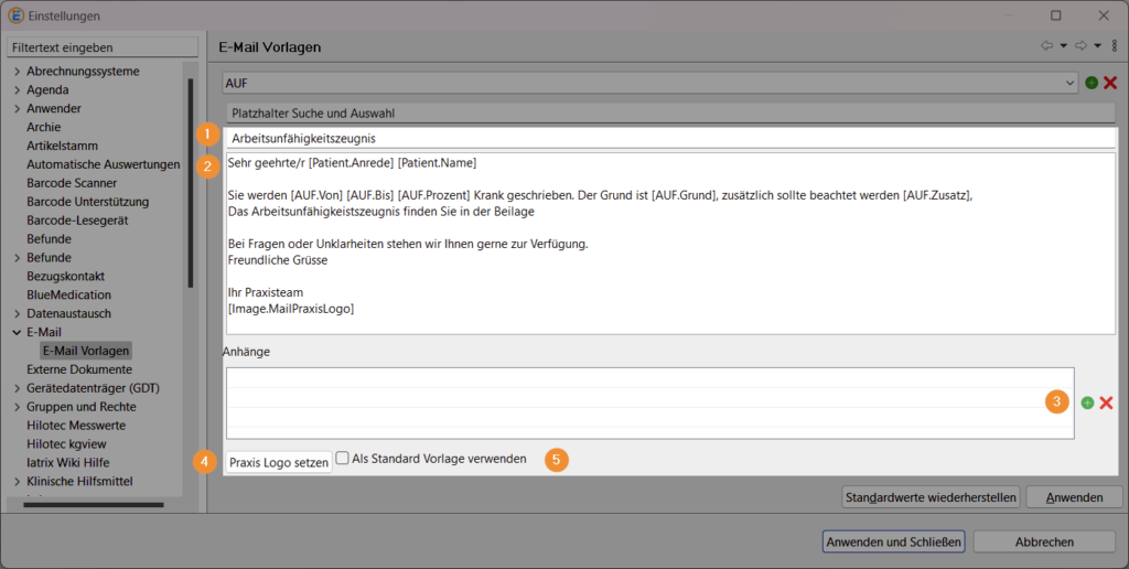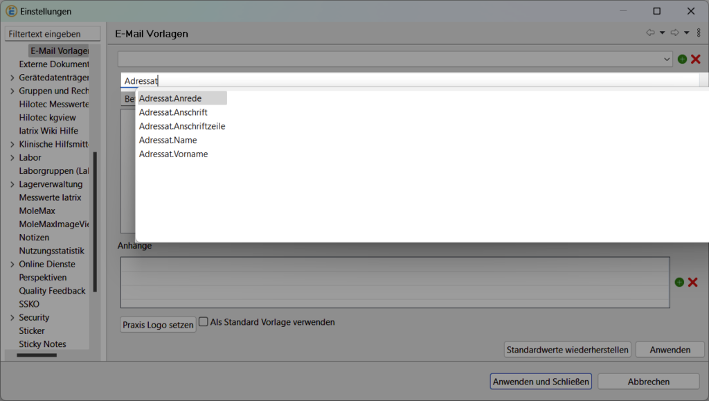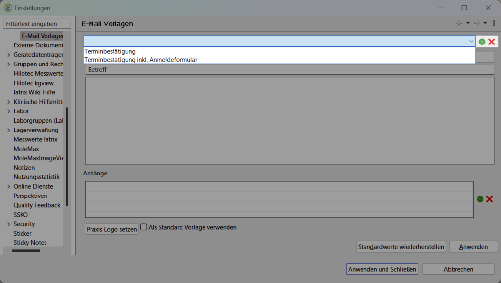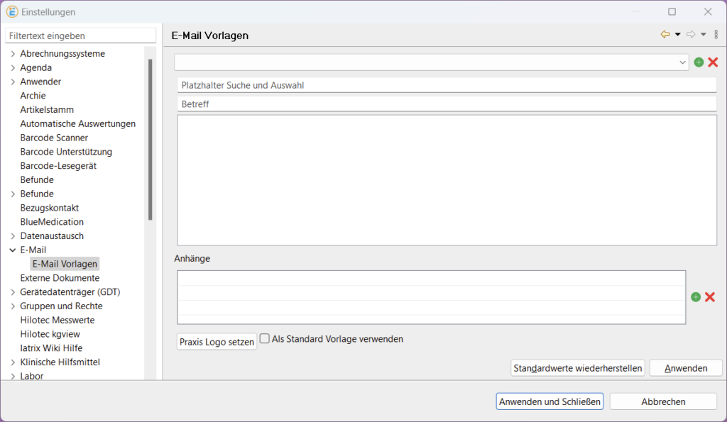 Im Elexis oben rechts Datei –> Einstellungen –> E-Mail –> E-Mail Vorlagen öffnen.