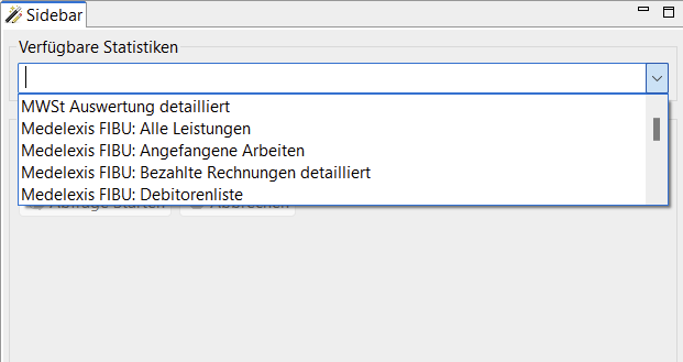 Nachfolgend werden die Funktionen der Statistiken im Detail erklärt. In der View Sidebar können Sie Ihre gewünschten Statistiken wählen. Ein Grossteil der Statistiken gehört zur Finanzbuchhaltung (FIBU).