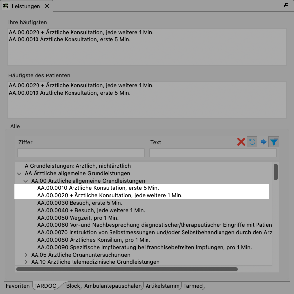 Die View Leistungen öffnet sich. Der Reiter für TARDOC sollte sichtbar sein. Suchen Sie Ihre Leistungen wie gewohnt über Ziffer oder Text.