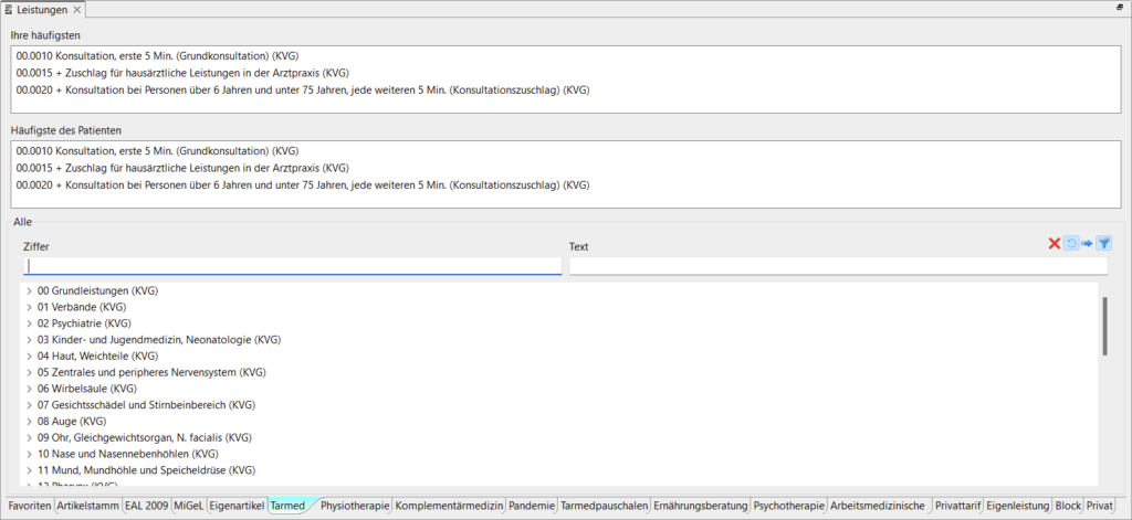 - Im Hauptareal kann nach einer Position innerhalb der Kategorie gesucht werden, z. B. bei Tarmed 00.0010