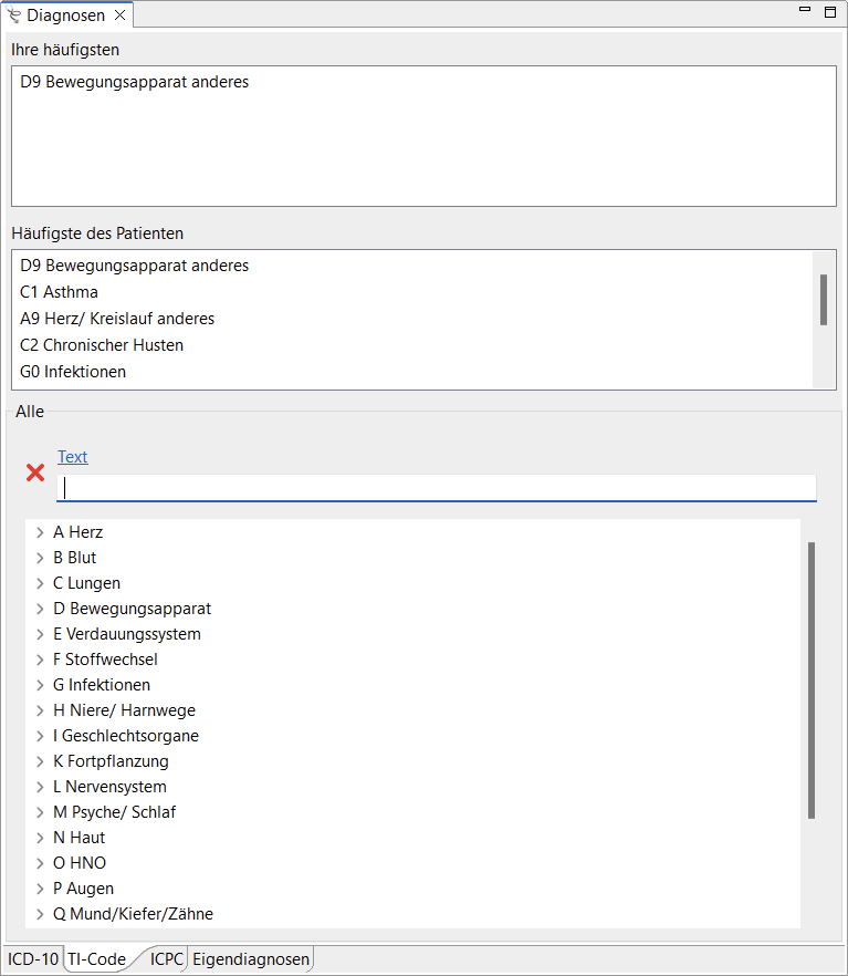 - Im Fussbereich der View sind Reiter für den Aufruf verschiedener Diagnose-Klassifikationen: