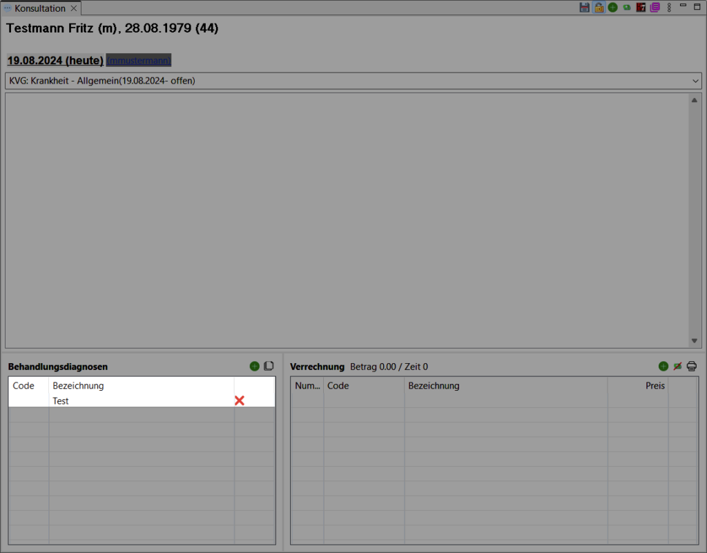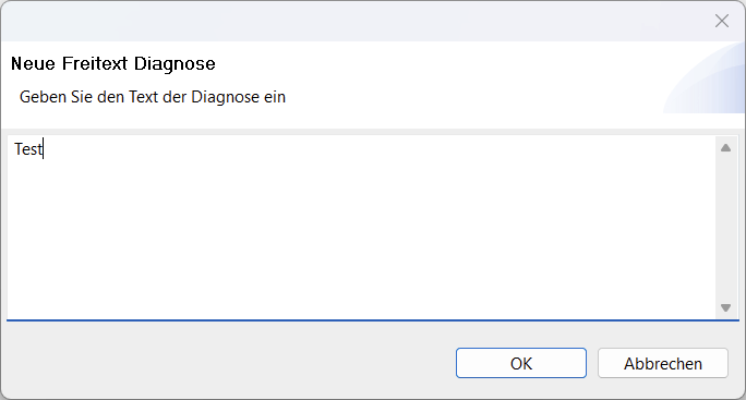 im Behandlungsdiagnosen Fenster der Konsultation View für eine Freitext Diagnose. Nachdem öffnet sich der Dialog Neue Freitext Diagnose und Sie können dieser einen Namen geben wie z. B. Test.