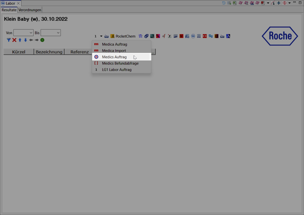 Wählen Sie hierzu den gewünschten Patienten, für den Sie einen Laborauftrag an Medics übermitteln möchten. Öffnen Sie in der View Labor das Dropdown Menü