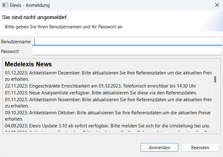 Beim Öffnen vom Elexis sehen Sie in den Medelexis News, wenn der Artikelstamm, Mittel und Gegenstandsliste und weitere Referenzdaten zu aktualisieren sind.