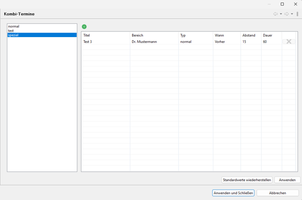In Elexis 3.12 ist es möglich, Terminkombinationen zu setzen. Wird ein Termin mit dem konfigurierten Termintyp erstellt, so wird automatisch ein zweiter Termin zum gewünschten Zeitpunkt im gewünschten Agendabereich erstellt.