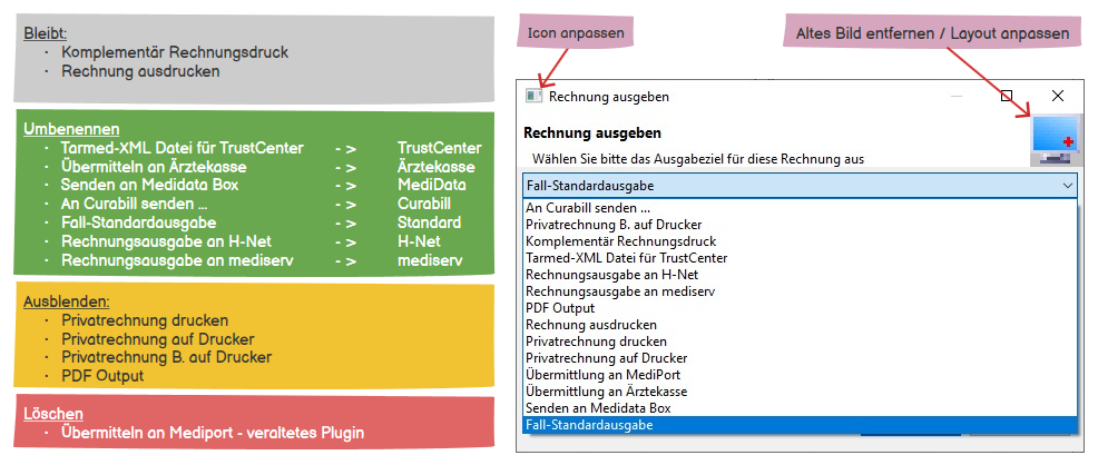 Die Ziele für die Rechnungsausgabe wurden umbenannt oder ausgeblendet. Folgende Änderungen wurden vorgenommen: