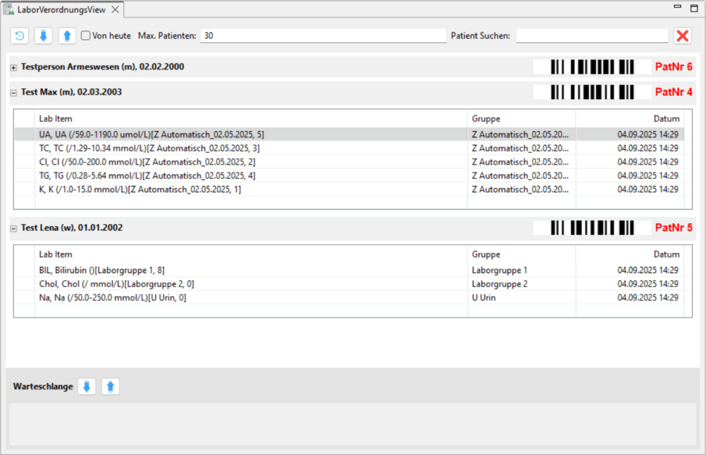 Alle Patientinnen und Patienten werden in dieser Liste mit einem Barcode angezeigt. Befindet sich der Bildschirm in Reichweite des Laborgeräts, kann der Barcode einfach per Scanner eingelesen werden – die manuelle Eingabe der Patientennummer entfällt vollständig.
